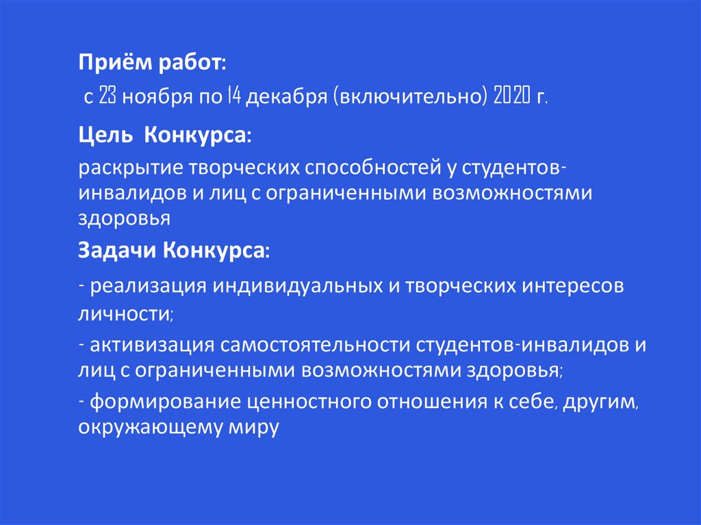 Приём работ:с 23 ноября по 14 декабря (включительно) 2020 г.