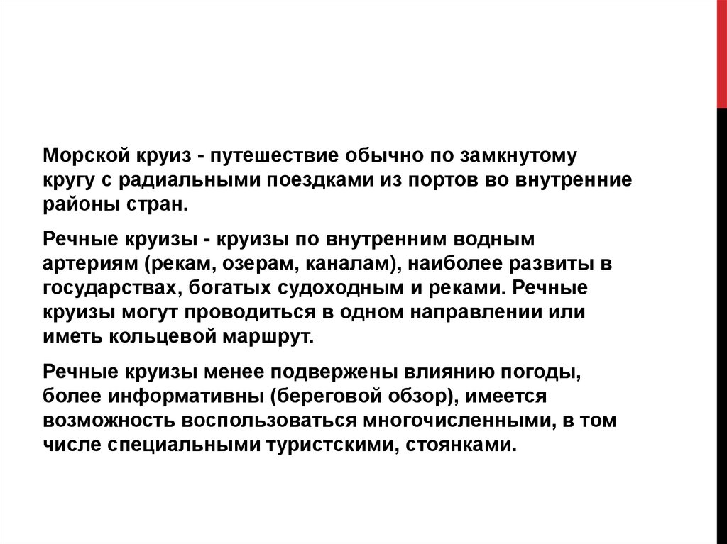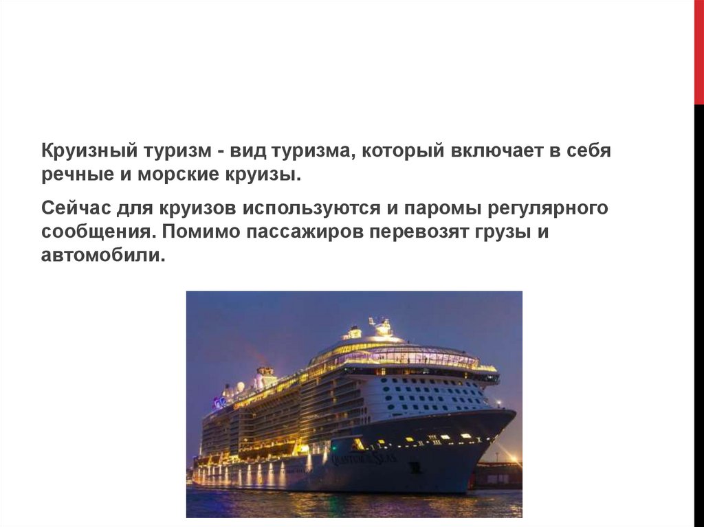 Круизный туризм - вид туризма, который включает в себяречные и морские круизы.