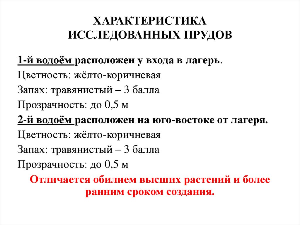ХАРАКТЕРИСТИКАИССЛЕДОВАННЫХ ПРУДОВ