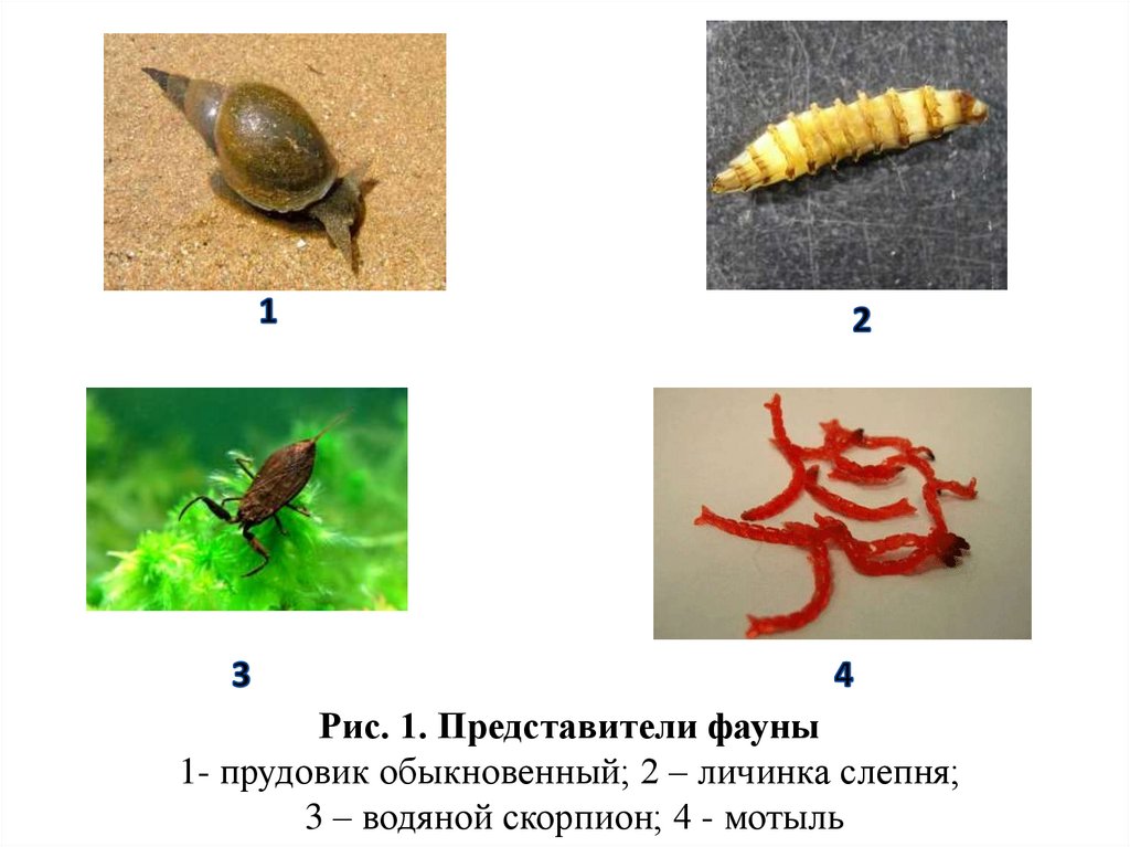 Рис. 1. Представители фауны1- прудовик обыкновенный; 2 – личинка слепня;