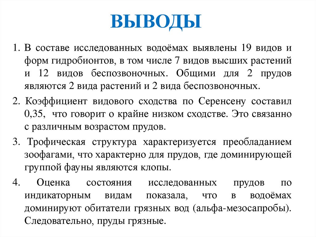ВЫВОДЫ1. В составе исследованных водоёмах выявлены 19 видов и