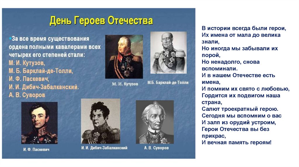 В истории всегда были герои,Их имена от мала до велика