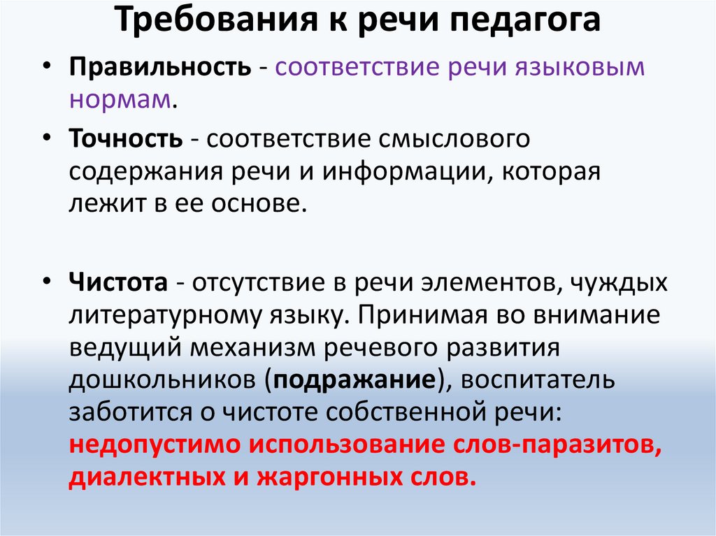 Требования к речи педагога• Правильность - соответствие речи языковым