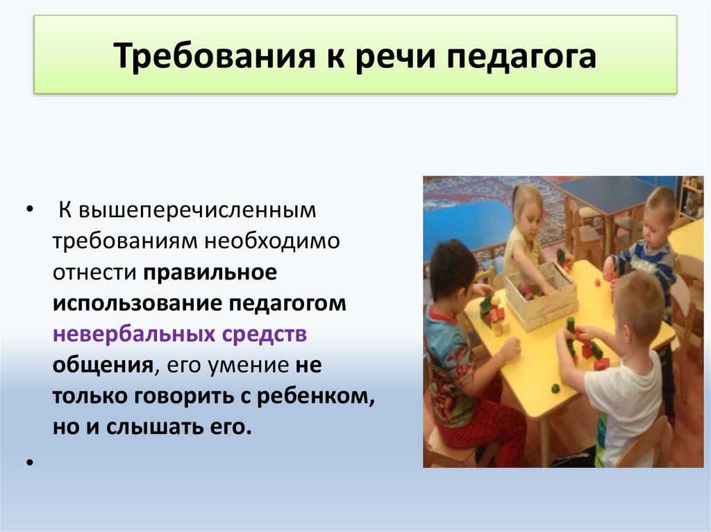 Требования к речи педагога• К вышеперечисленным
