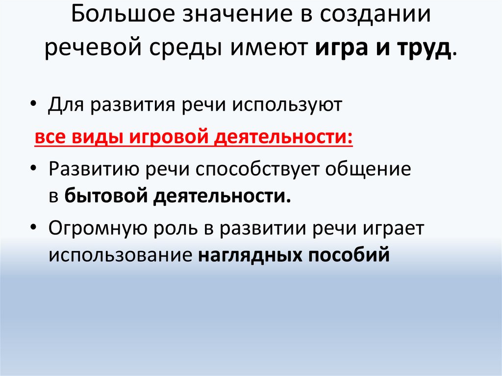 Большое значение в созданииречевой среды имеют игра и труд.