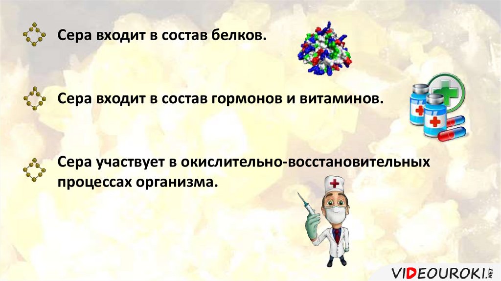 Сера входит в состав белков.Сера входит в состав гормонов и витаминов.