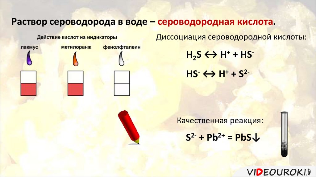 Раствор сероводорода в воде – сероводородная кислота.Диссоциация сероводородной кислоты: