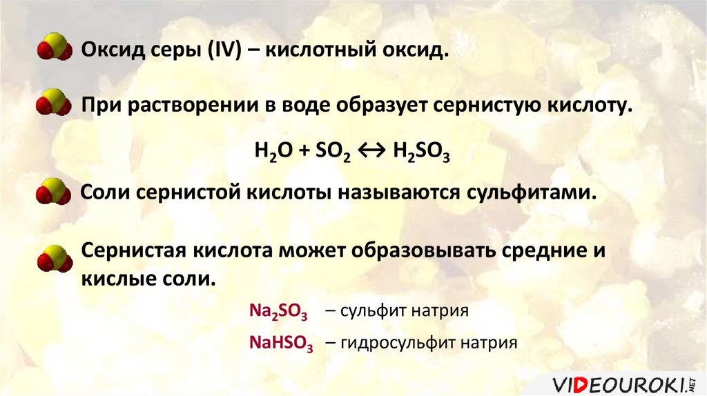Оксид серы (IV) – кислотный оксид.При растворении в воде образует сернистую кислоту.
