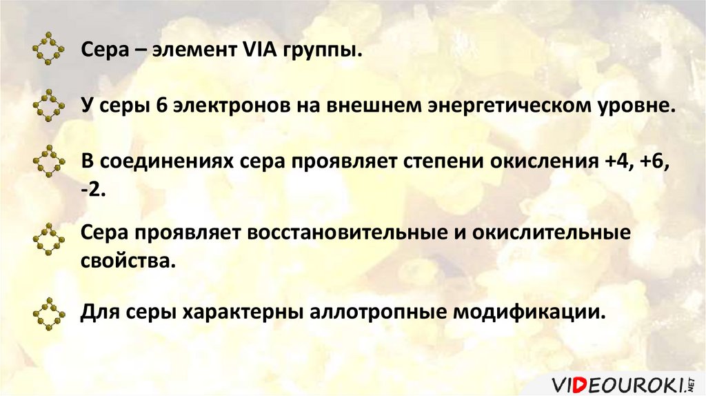 Сера – элемент VIA группы.У серы 6 электронов на внешнем энергетическом уровне.
