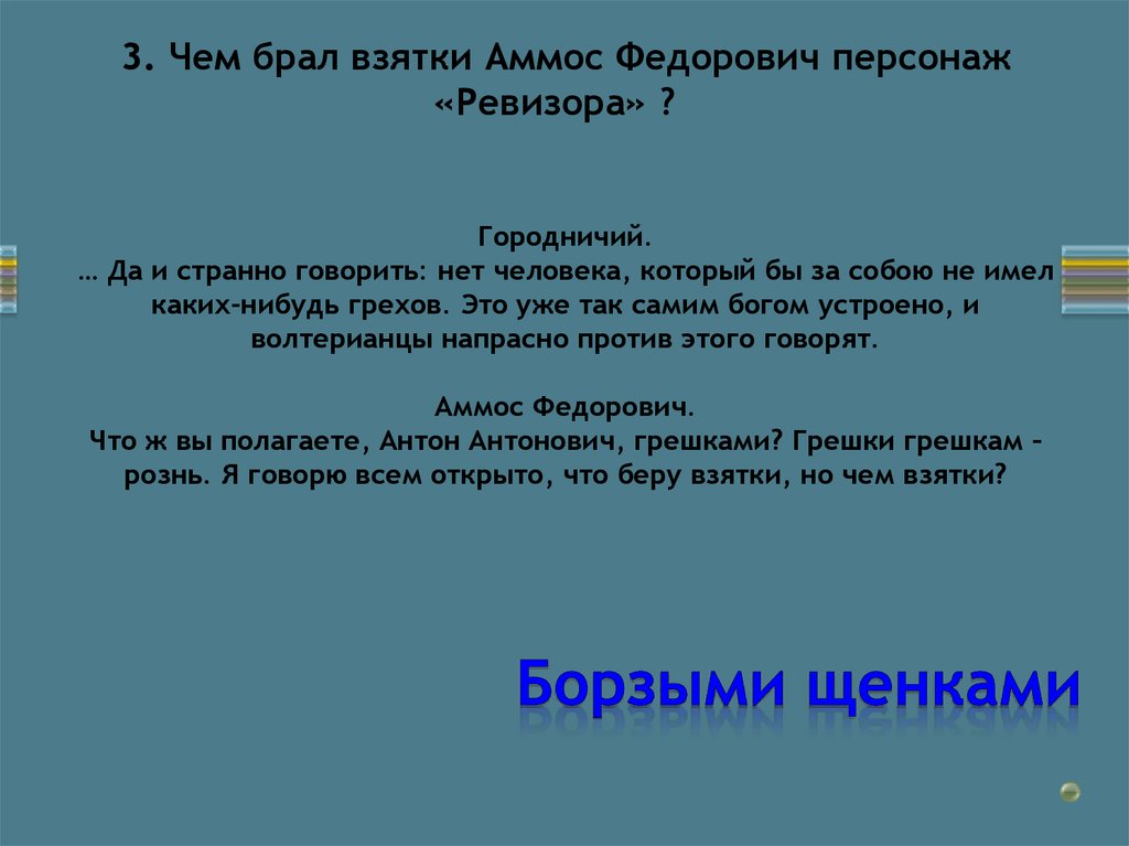 3. Чем брал взятки Аммос Федорович персонаж«Ревизора» ?