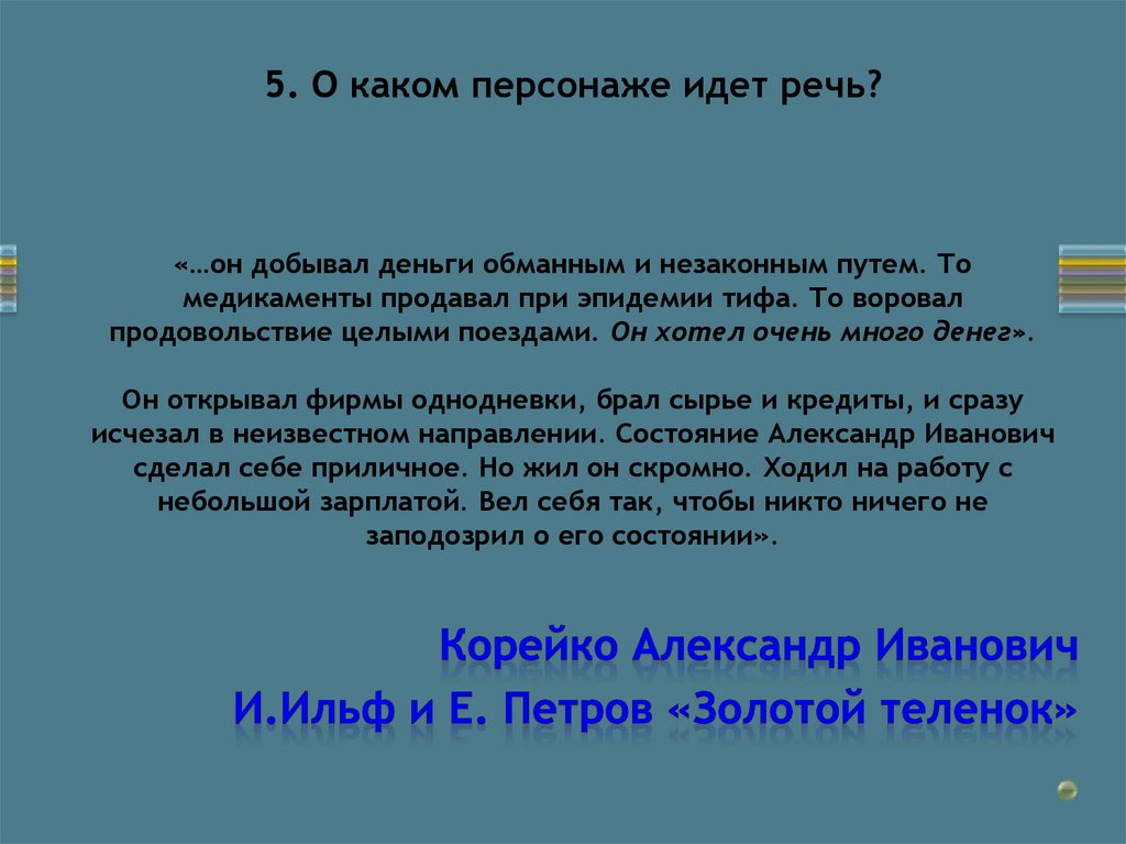 5. О каком персонаже идет речь?«…он добывал деньги обманным и незаконным путем. То