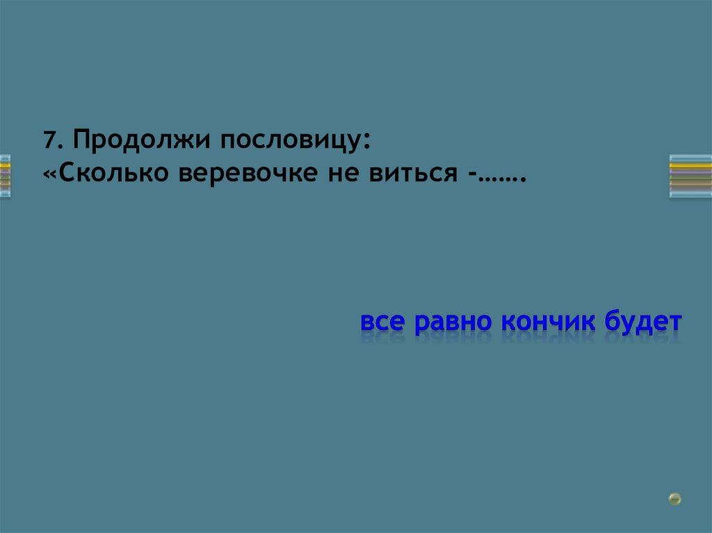 7. Продолжи пословицу:«Сколько веревочке не виться -…….