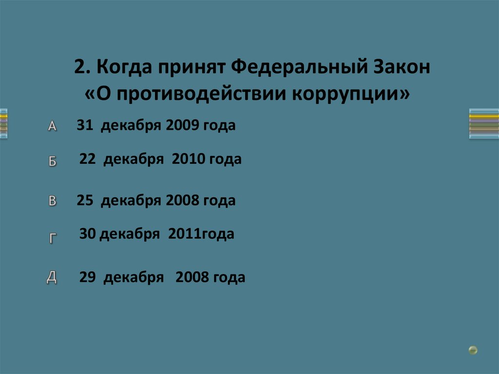 2. Когда принят Федеральный Закон«О противодействии коррупции»
