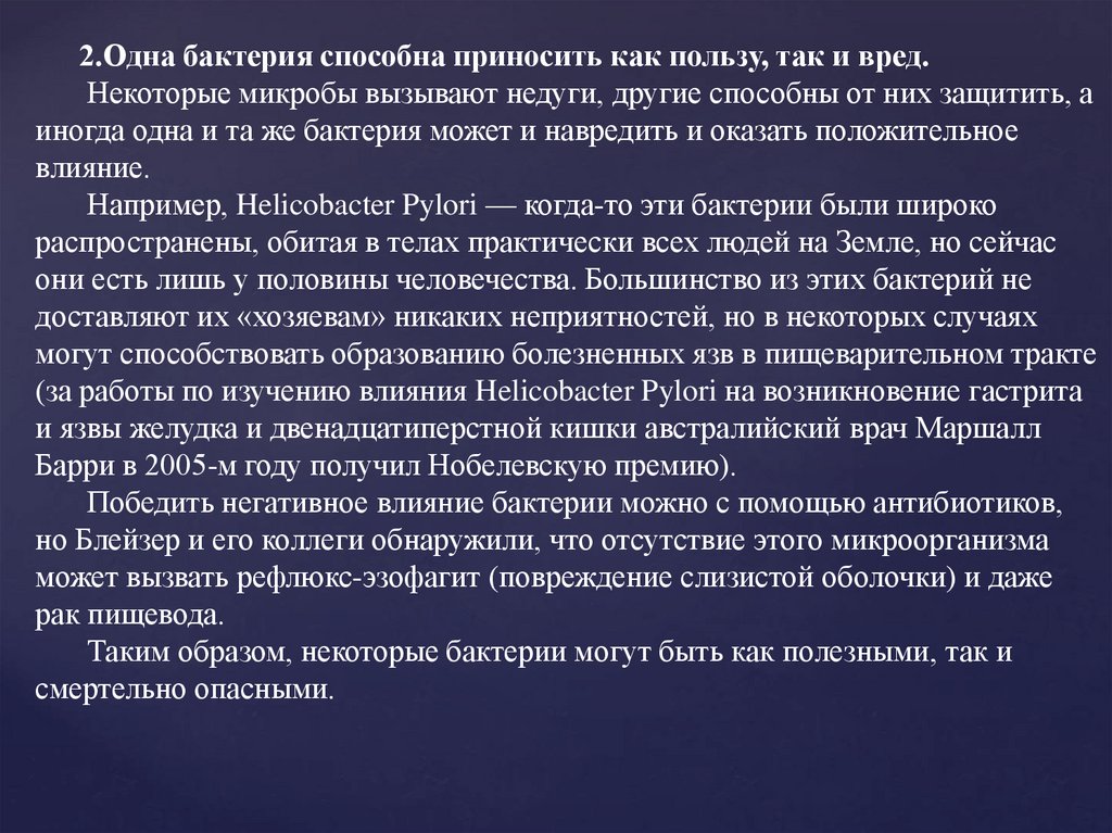 2.Одна бактерия способна приносить как пользу, так и вред.Некоторые микробы вызывают недуги, другие способны от них защитить, а