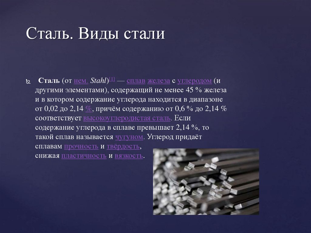 Сталь. Виды сталиСталь (от нем. Stahl)[1] — сплав железа с углеродом (и