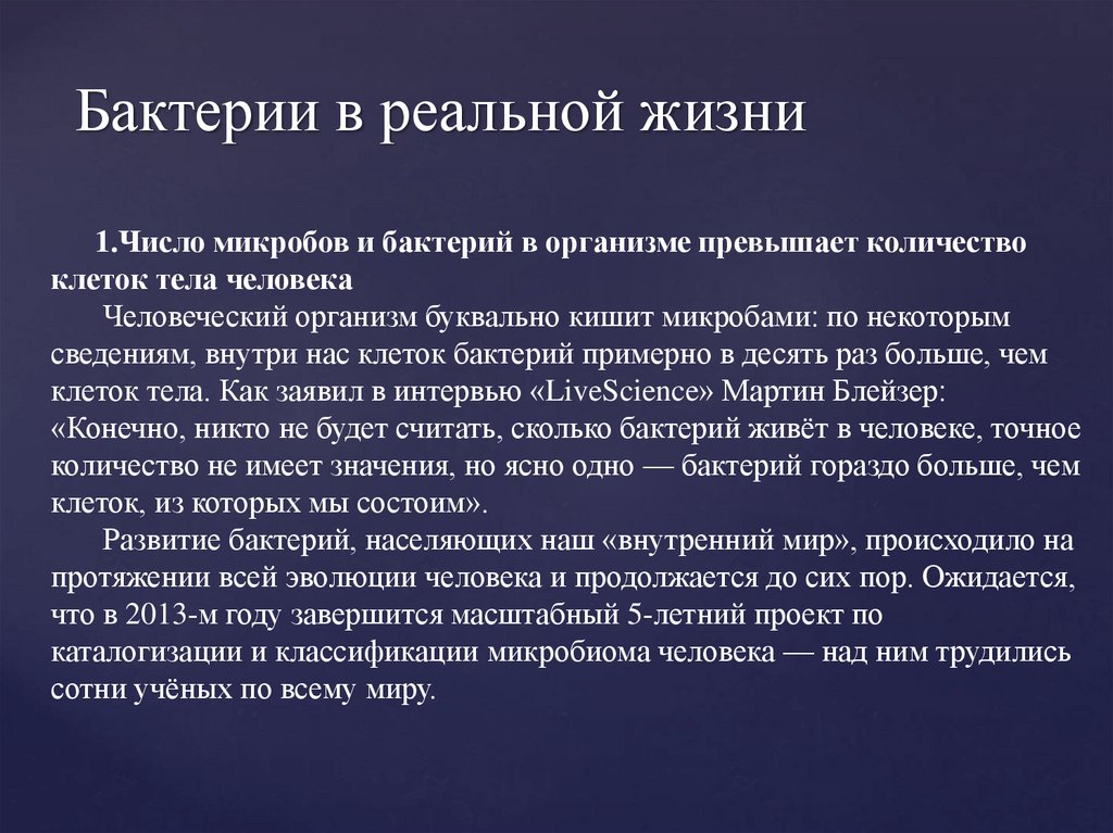 Бактерии в реальной жизни1.Число микробов и бактерий в организме превышает количество