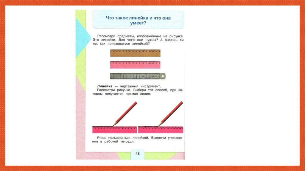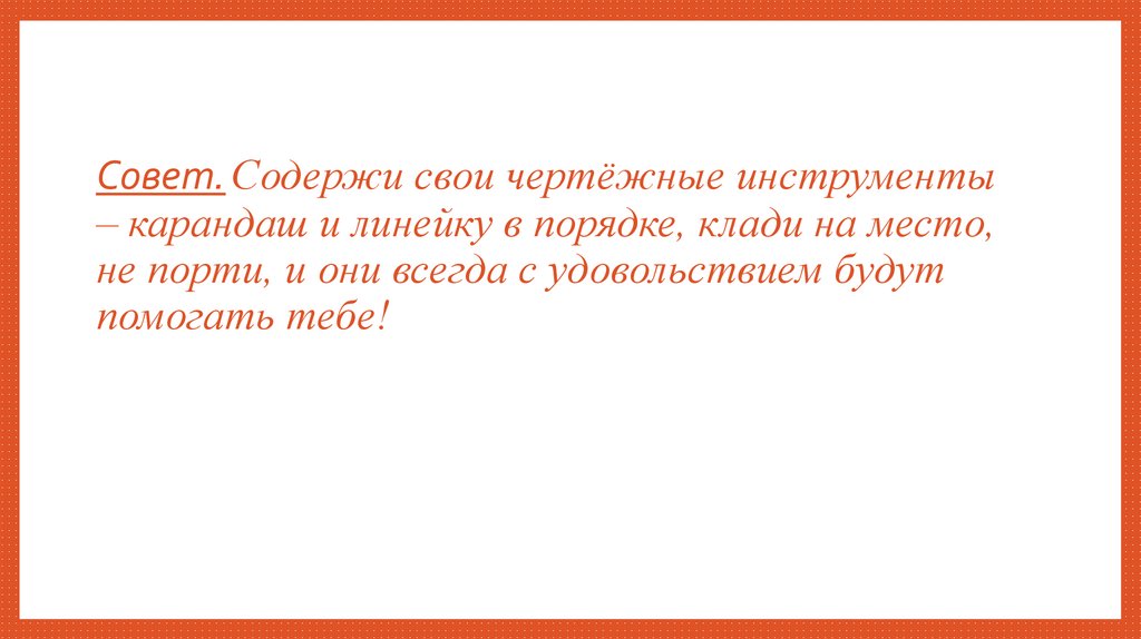 Совет. Содержи свои чертёжные инструменты– карандаш и линейку в порядке, клади на место,