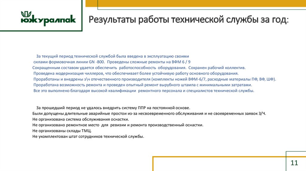 Результаты работы технической службы за год:За текущий период технической службой была введена в эксплуатацию своими