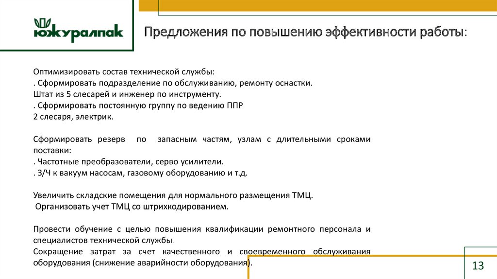 Предложения по повышению эффективности работы:Оптимизировать состав технической службы: