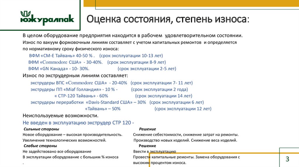 Оценка состояния, степень износа:В целом оборудование предприятия находится в рабочем удовлетворительном состоянии.