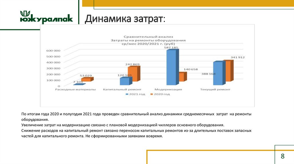 Динамика затрат:По итогам года 2020 и полугодия 2021 года проведен сравнительный анализ динамики среднемесячных затрат на ремонты
