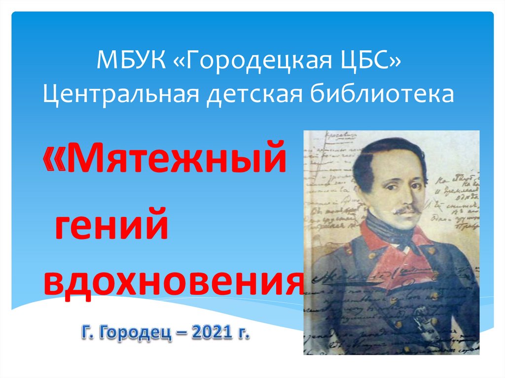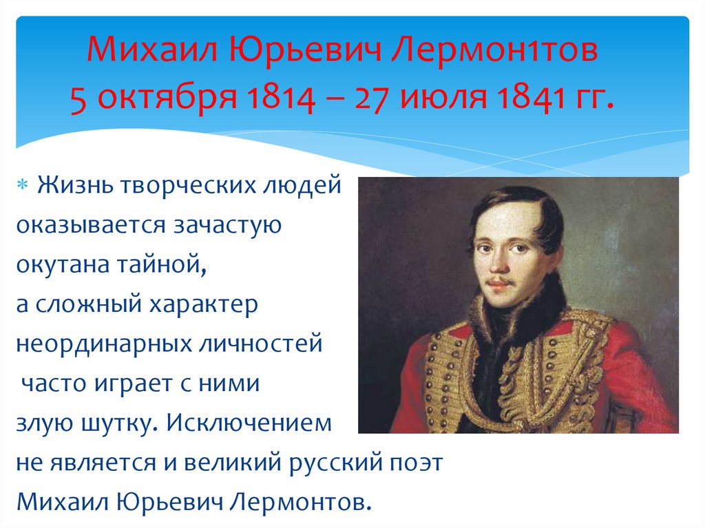 Михаил Юрьевич Лермон1тов5 октября 1814 – 27 июля 1841 гг.