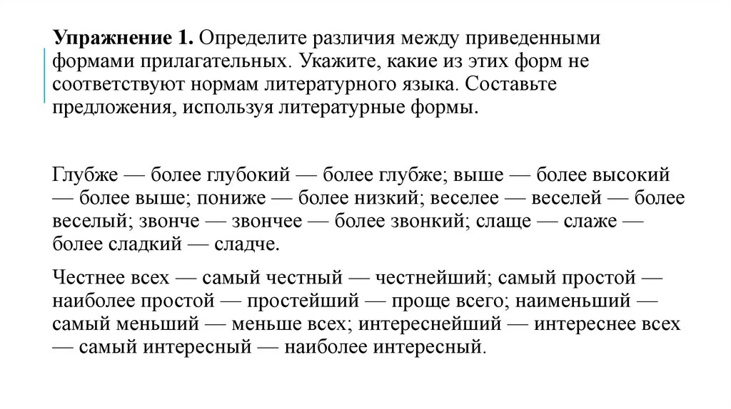 Упражнение 1. Определите различия между приведеннымиформами прилагательных. Укажите, какие из этих форм не