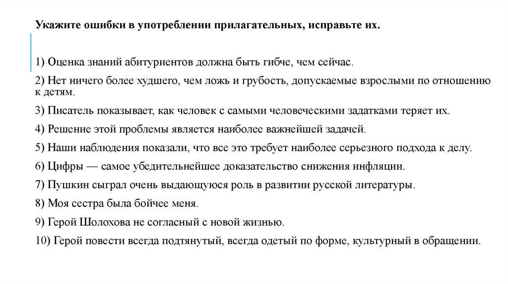 Укажите ошибки в употреблении прилагательных, исправьте их.1) Оценка знаний абитуриентов должна быть гибче, чем сейчас.