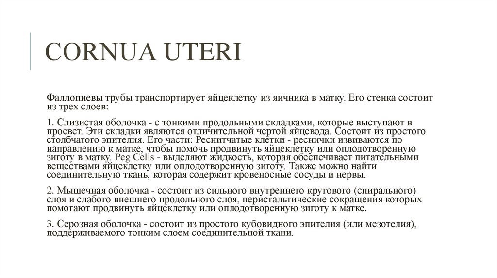 СORNUA UTERIФаллопиевы трубы транспортирует яйцеклетку из яичника в матку. Его стенка состоит