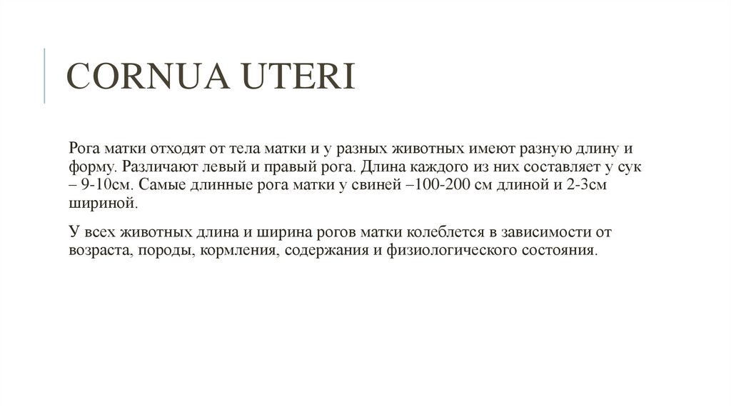 СORNUA UTERIРога матки отходят от тела матки и у разных животных имеют разную длину и