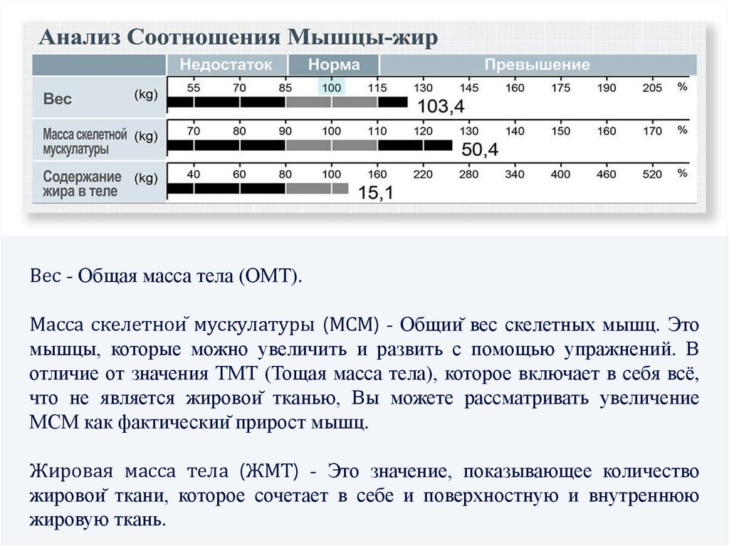 Вес - Общая масса тела (ОМТ).Масса скелетной мускулатуры (МСМ) - Общий вес скелетных мышц. Это