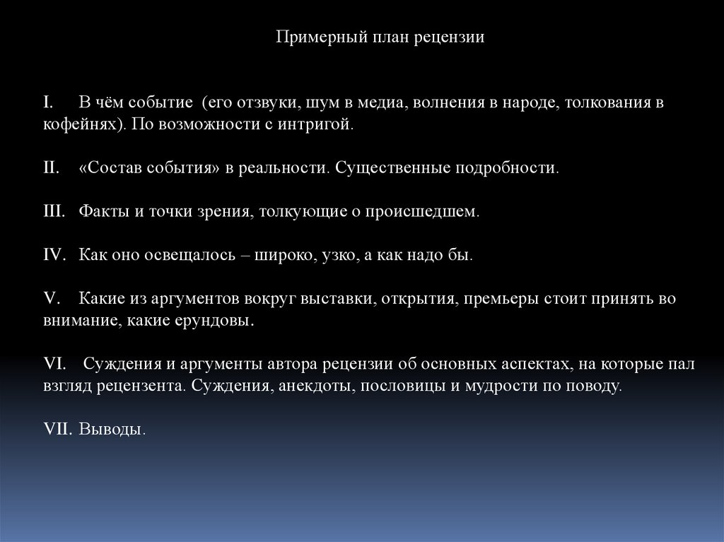 Примерный план рецензииI. В чём событие (его отзвуки, шум в медиа, волнения в народе, толкования в