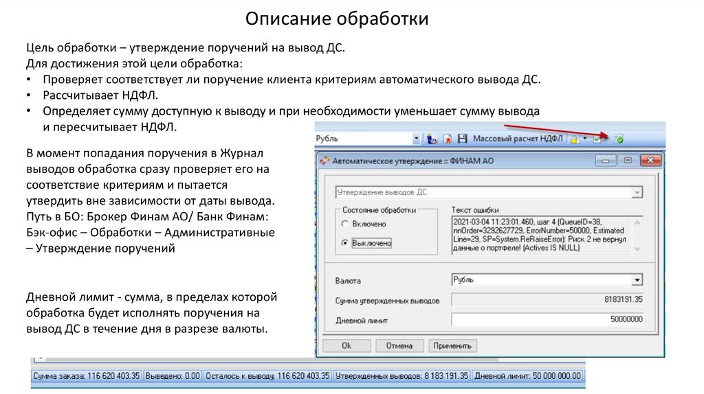 Описание обработкиЦель обработки – утверждение поручений на вывод ДС.