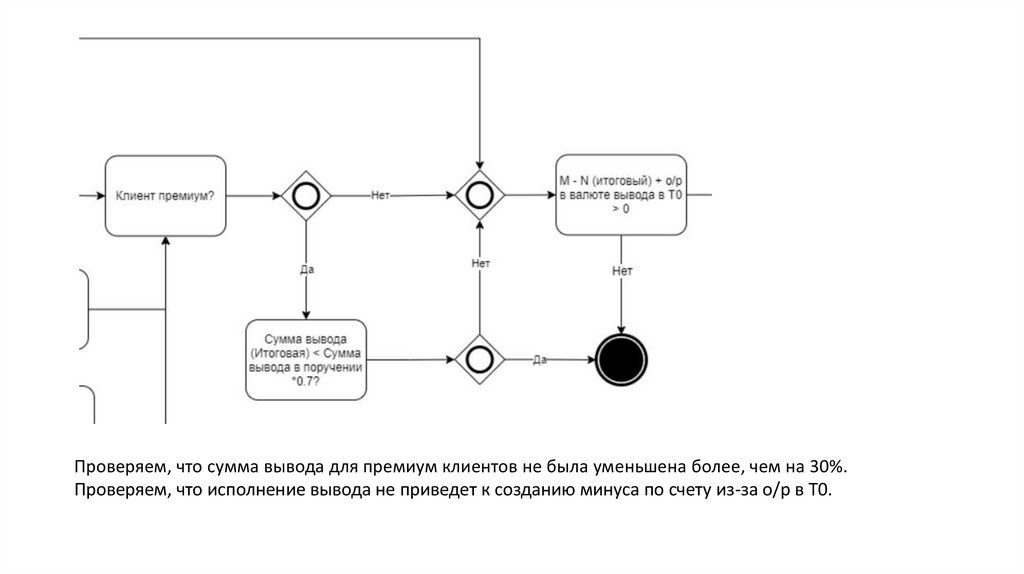 Проверяем, что сумма вывода для премиум клиентов не была уменьшена более, чем на 30%.Проверяем, что исполнение вывода не приведет к созданию минуса по счету из-за о/р в Т0.