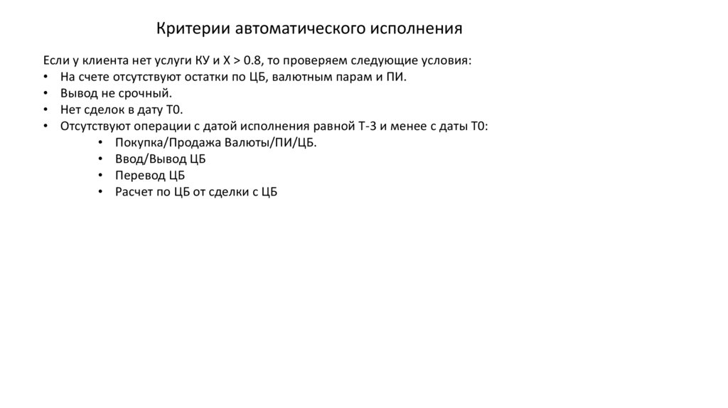 Критерии автоматического исполненияЕсли у клиента нет услуги КУ и Х > 0.8, то проверяем следующие условия: