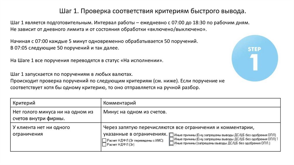 Шаг 1. Проверка соответствия критериям быстрого вывода.Шаг 1 является подготовительным. Интервал работы – ежедневно с 07:00 до 18:30 по рабочим дням.