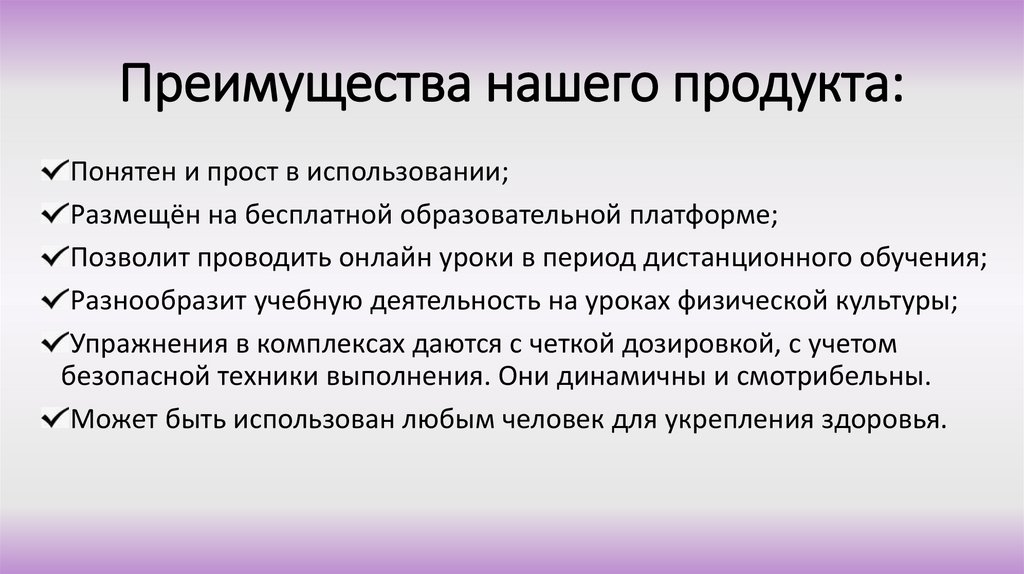 Преимущества нашего продукта:Понятен и прост в использовании;