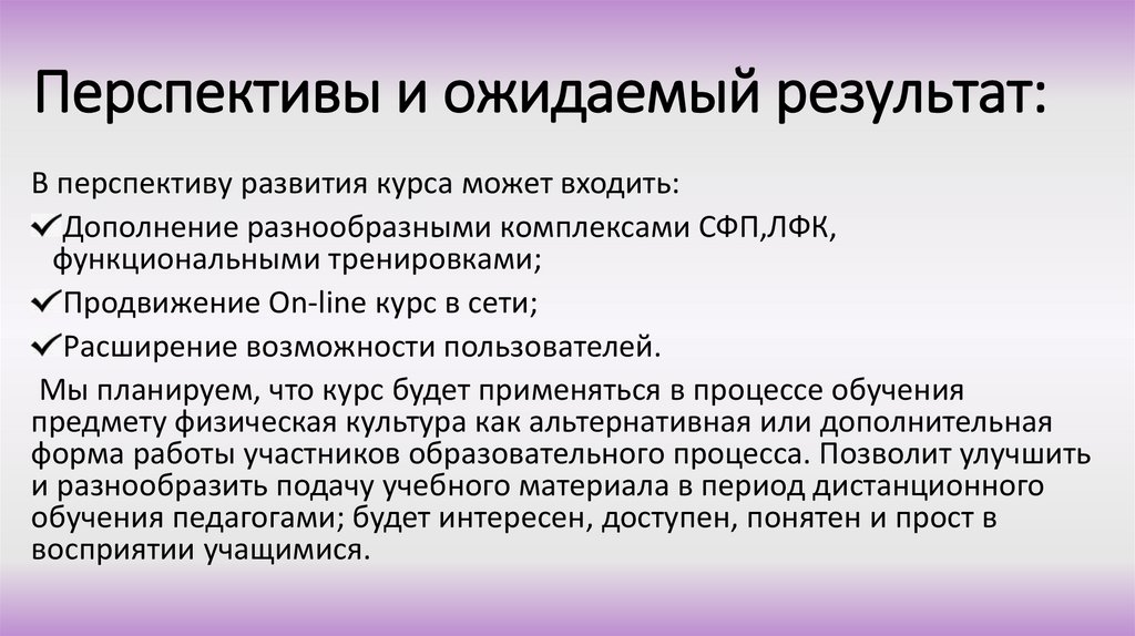 Перспективы и ожидаемый результат:В перспективу развития курса может входить: