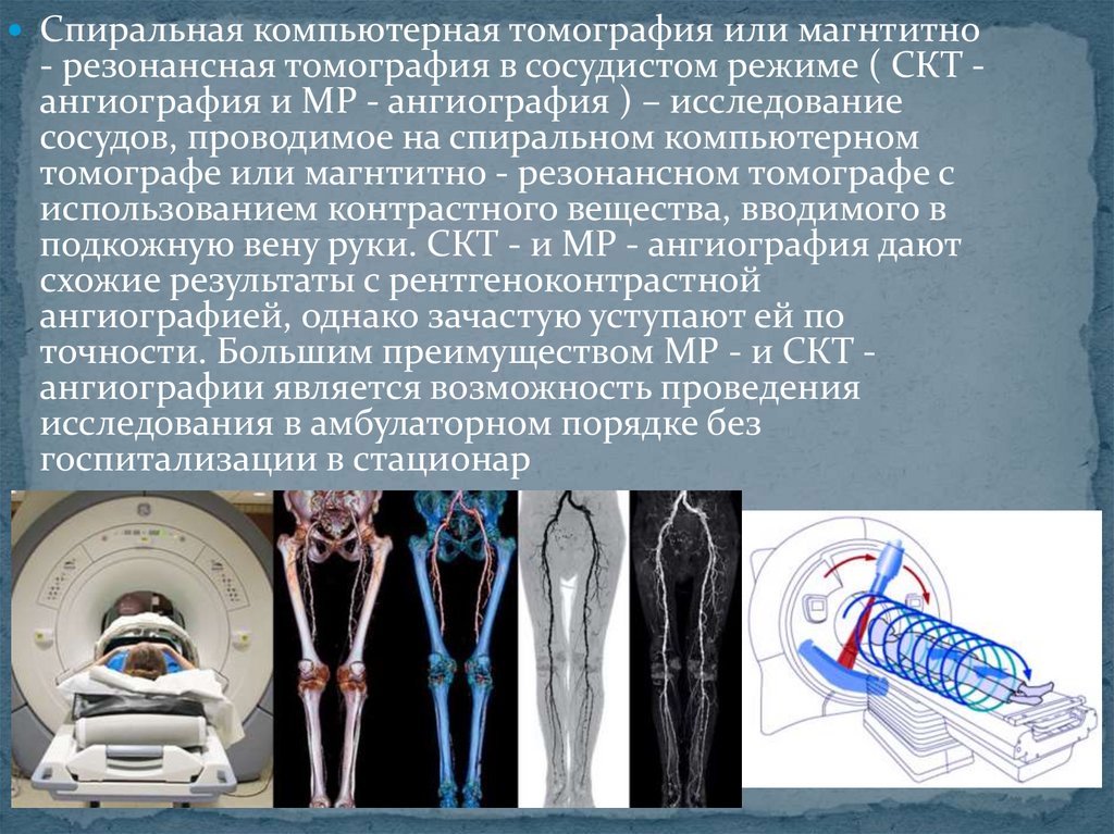 Спиральная компьютерная томография или магнтитно- резонансная томография в сосудистом режиме ( СКТ ангиография и МР - ангиография ) – исследование