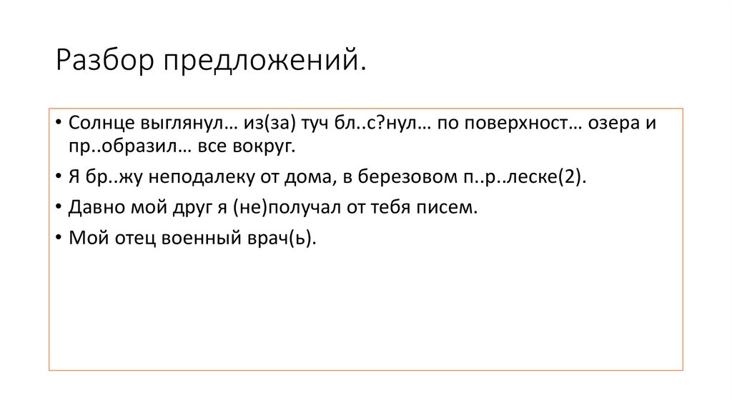 Разбор предложений.• Солнце выглянул… из(за) туч бл..с?нул… по поверхност… озера и