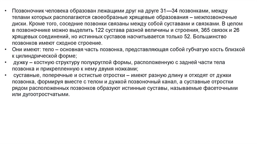 • Позвоночник человека образован лежащими друг на друге 31—34 позвонками, междутелами которых располагаются своеобразные хрящевые образования – межпозвоночные
