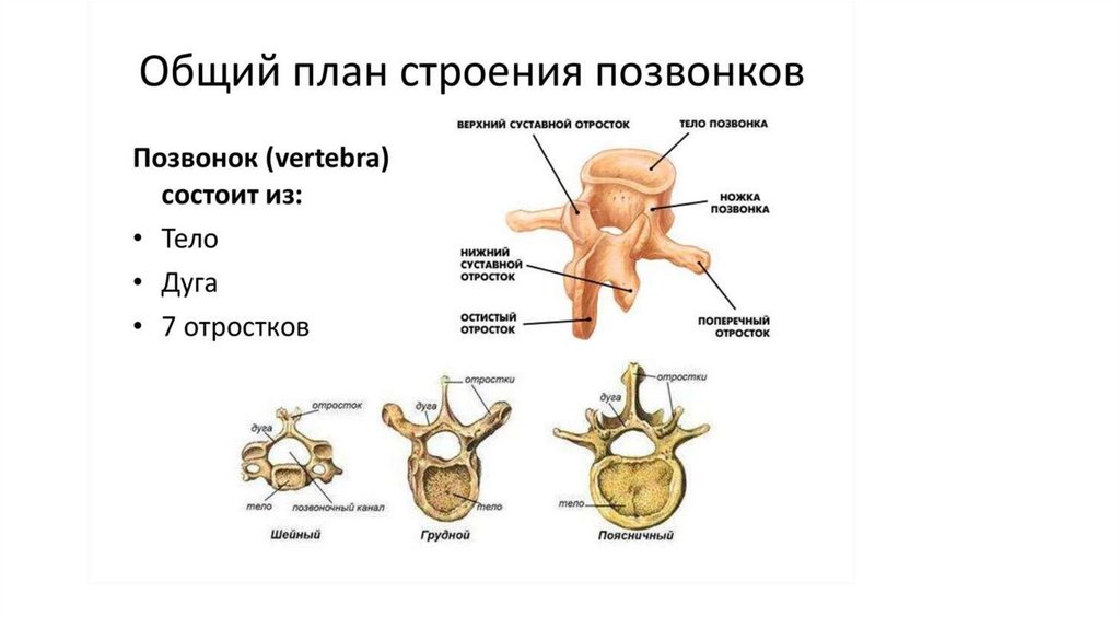 • Они имеют: тело – основная часть позвонка, представляющая собой губчатую кость близкой