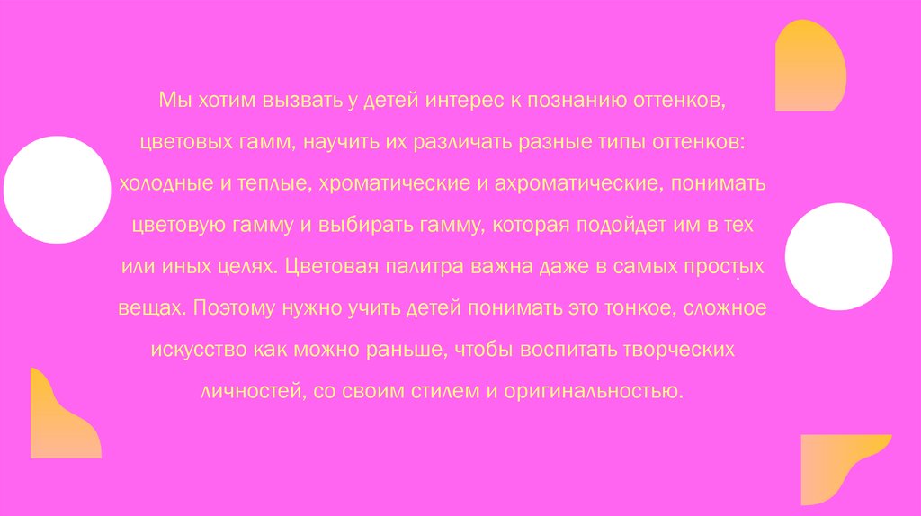 Мы хотим вызвать у детей интерес к познанию оттенков,цветовых гамм, научить их различать разные типы оттенков: