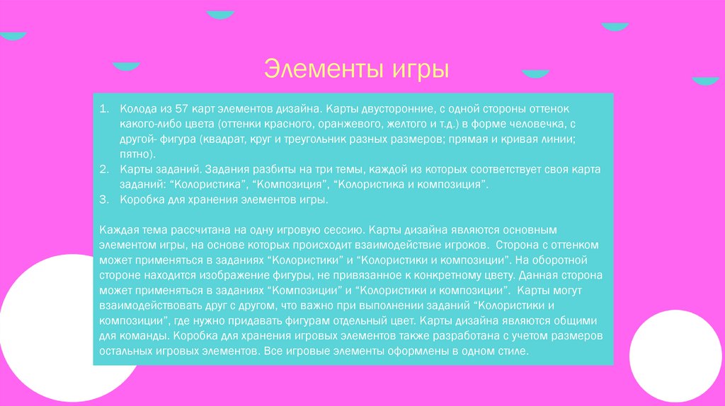 Элементы игры1. Колода из 57 карт элементов дизайна. Карты двусторонние, с одной стороны оттенок