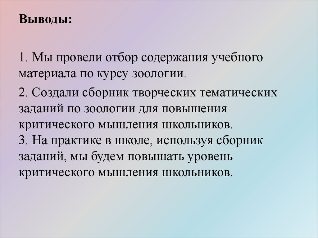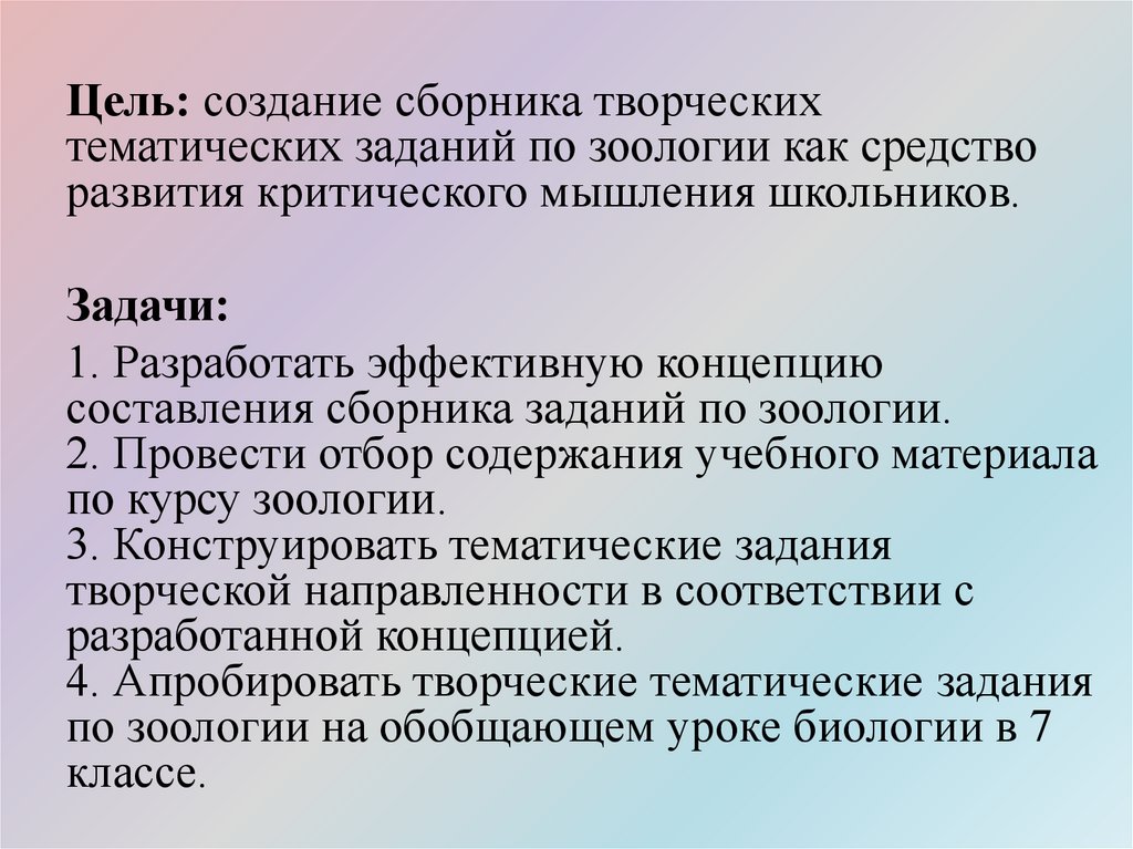 Цель: создание сборника творческихтематических заданий по зоологии как средство