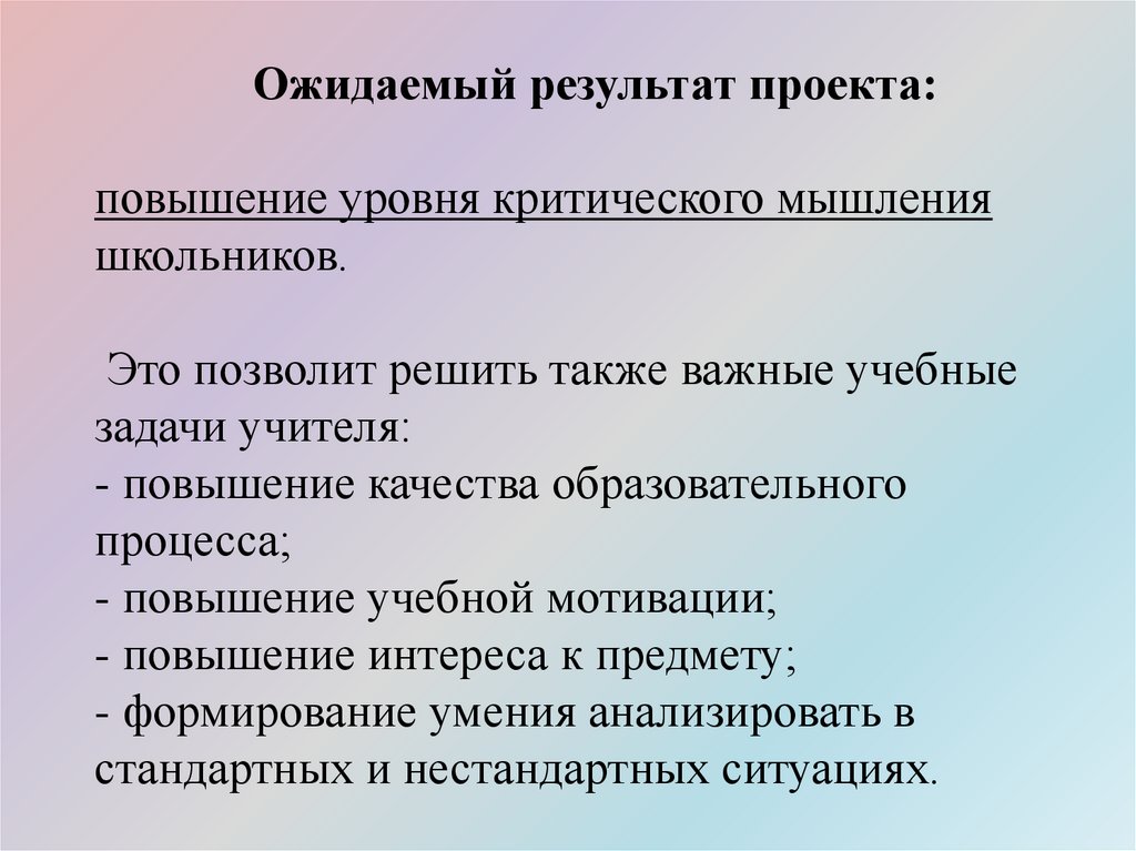 Ожидаемый результат проекта:повышение уровня критического мышления