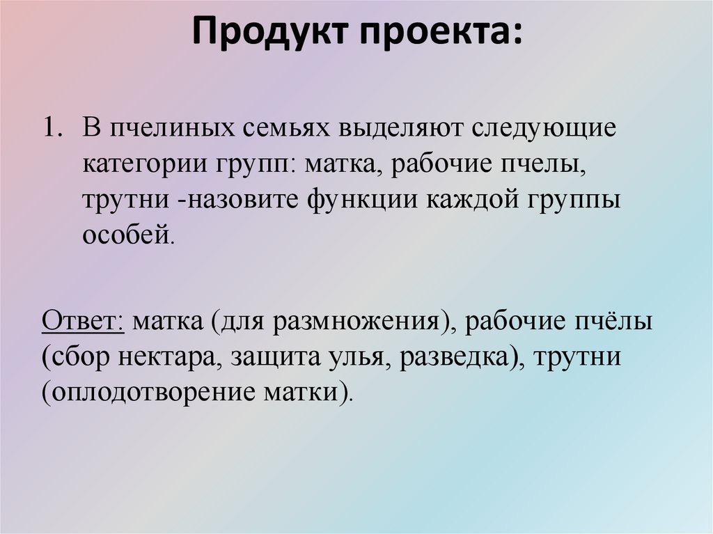 Продукт проекта:1. В пчелиных семьях выделяют следующие