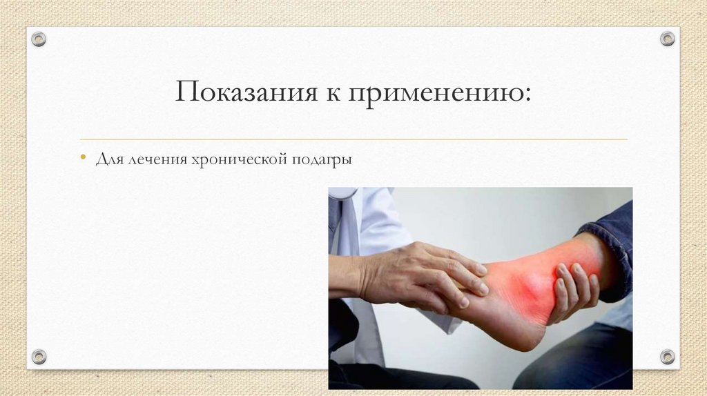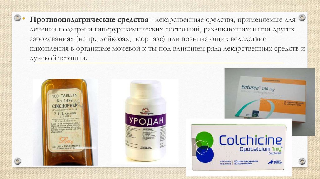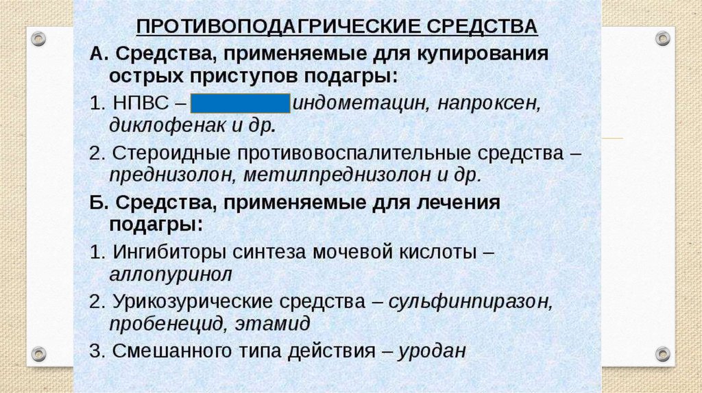 • Противоподагрические средства - лекарственные средства, применяемые длялечения подагры и гиперурикемических состояний, развивающихся при других