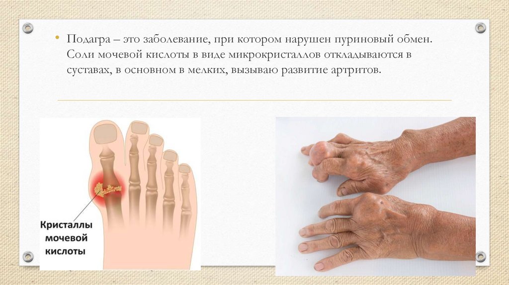 • Подагра – это заболевание, при котором нарушен пуриновый обмен.Соли мочевой кислоты в виде микрокристаллов откладываются в