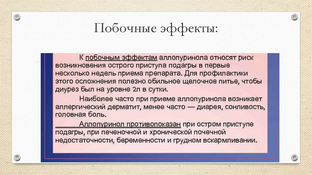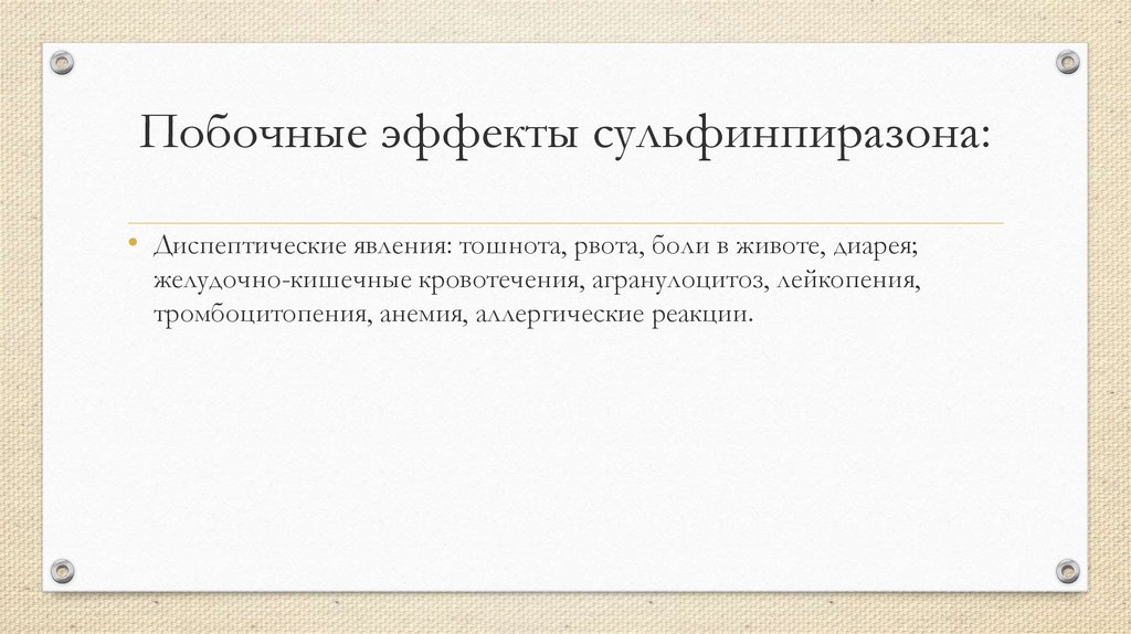 Побочные эффекты сульфинпиразона:• Диспептические явления: тошнота, рвота, боли в животе, диарея;